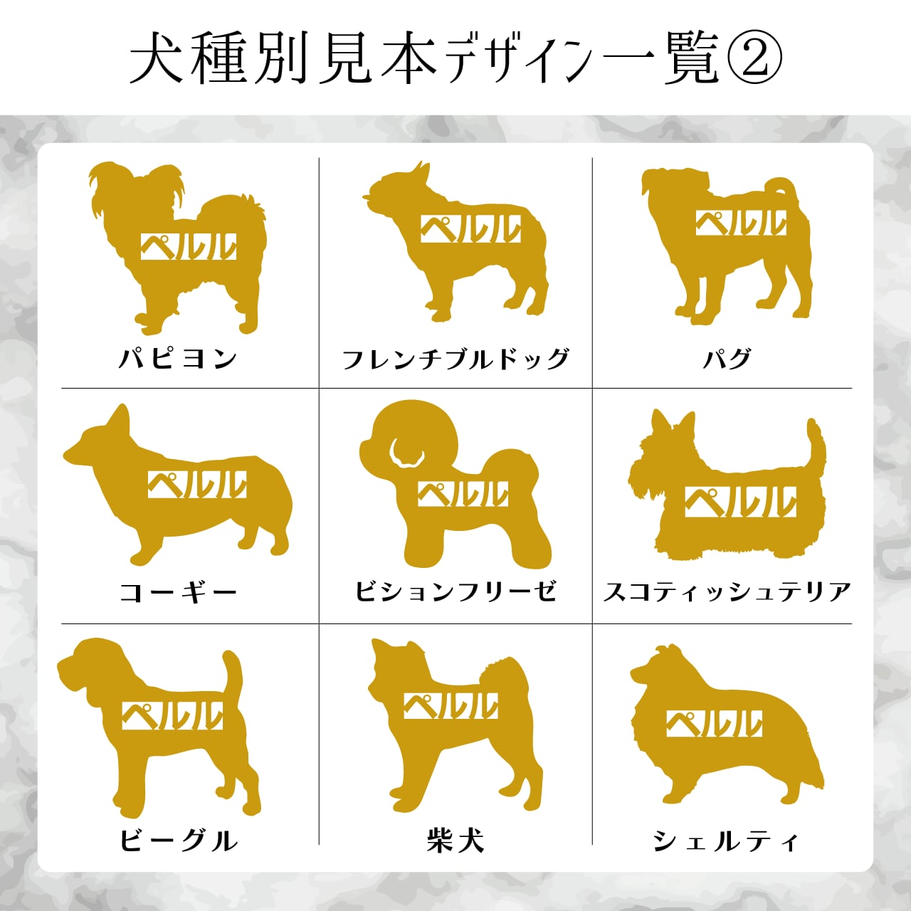 犬型(左横向きスタイル)のシルエットで、耳の形や体つきなど、犬種ごとのスタンダードな特徴を捉え、ひと目で「何犬か分かる」デザインに仕上げています。